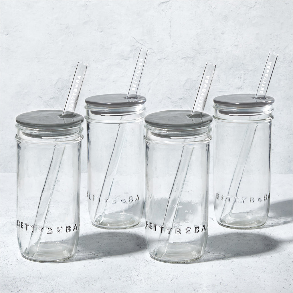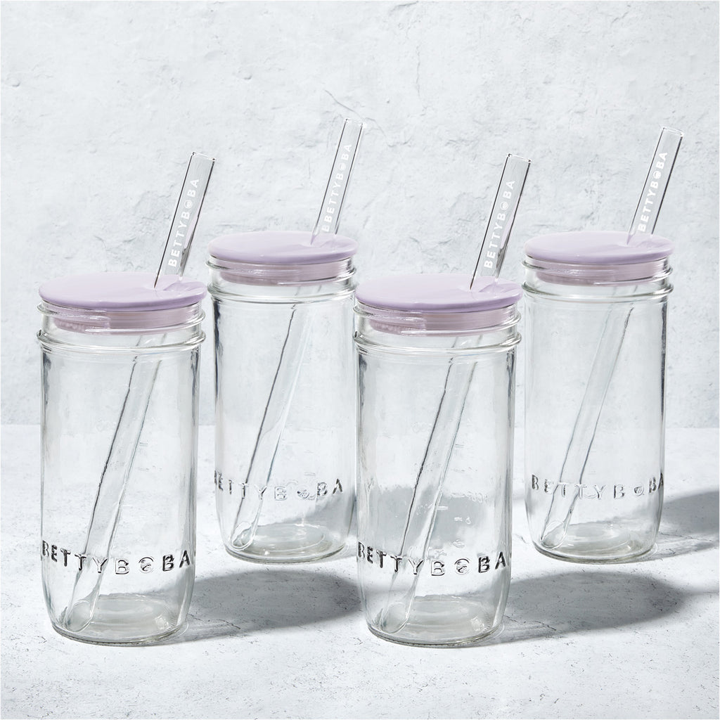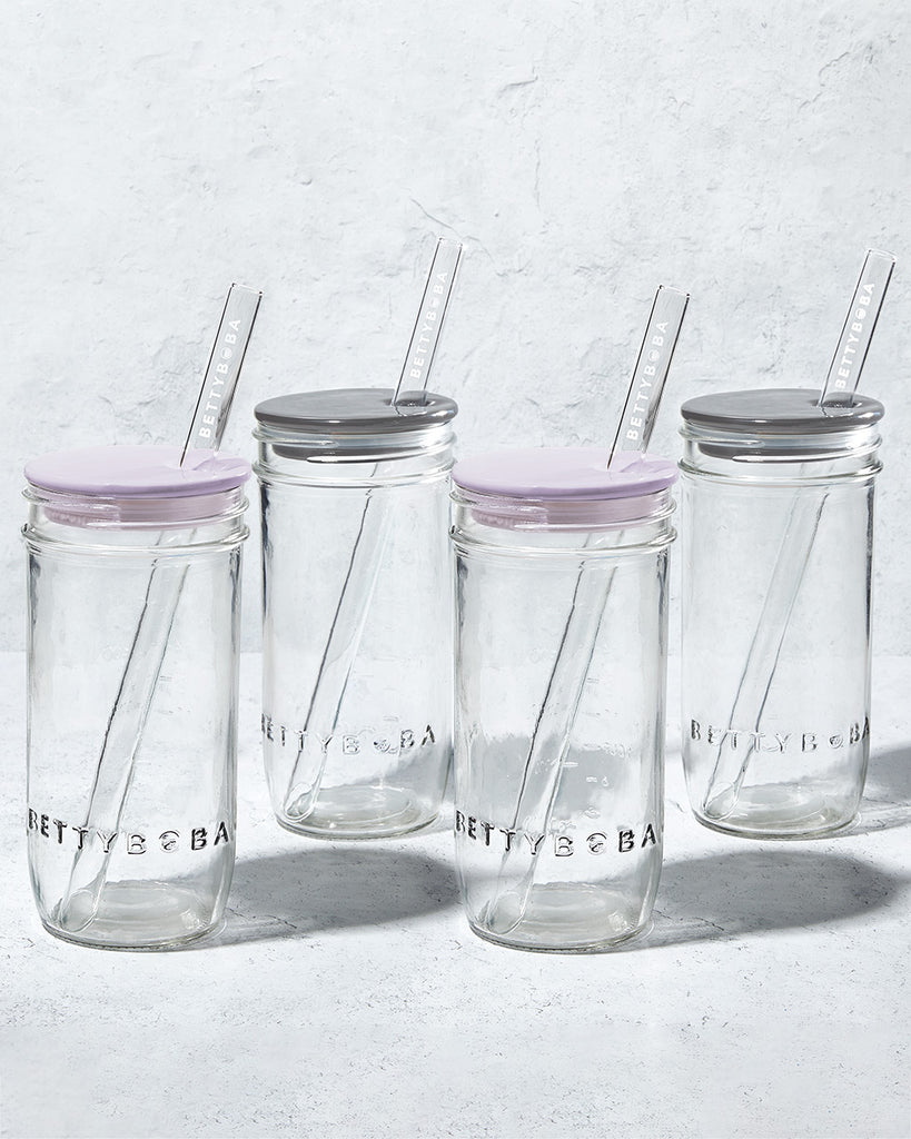 Save $25 when you get 4 tumblers! One for home, one for work/school, one for the car, and one for a friend ;) Each complete plastic-free set comes with the glass jar that keeps your drinks cool (or warm), a patent pending ceramic lid with a silicon plug, a glass boba straw that makes everything taste better, and a large straw cleaning brush, all designed perfectly for each other. Each piece is dishwasher safe for easy care.